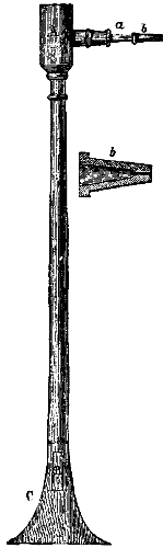The Blowpipe is a small instrument, made generally out of brass, silver, or German silver, and was principally used in earlier times for the purpose of soldering small pieces of metals together. It is generally made in the form of a tube, bent at a right angle, but without a sharp corner. The largest one is about seven inches long, and the smallest about two inches. The latter one terminates with a small point, with a small orifice. The first use of the blowpipe that we have recorded is that of a Swedish mining officer, who used it in the year 1738 for chemical purposes, but we have the most meagre accounts of his operations. In 1758 another Swedish mining officer, by the name of Cronstedt, published his "Use of the Blowpipe in Chemistry and Mineralogy," translated into English, in 1770, by Van Engestroem. Bergman extended its use, and after him Ghan and the venerable Berzelius (1821). The blowpipe most generally used in chemical examinations is composed of the following parts: (Fig. 1.) A is a little reservoir made air-tight by grinding the part B into it. This reservoir serves the purpose of retaining the moisture with which the air from the mouth is charged. A small conical tube is fitted to this reservoir. This tube terminates in a fine orifice. As this small point is liable to get clogged up with soot, etc., it is better that it should be made of platinum, so that it may be ignited. Two of these platinum tubes should be supplied, differing in the size of the orifice, by which a stronger or lighter current of flame may be projected from it. Metals, such as brass or German silver, are very liable to become dirty through oxidation, and when placed between the lips are liable to impart a disagreeable taste. To avoid this, the top of the tube must be supplied with a mouthpiece of ivory or horn C. The blowpipe here represented is the one used by Ghan, and approved by Berzelius. The trumpet mouthpiece was adopted by Plattner; it is pressed upon the lips while blowing, which is less tiresome than holding the mouthpiece between the lips, although many prefer the latter mode.