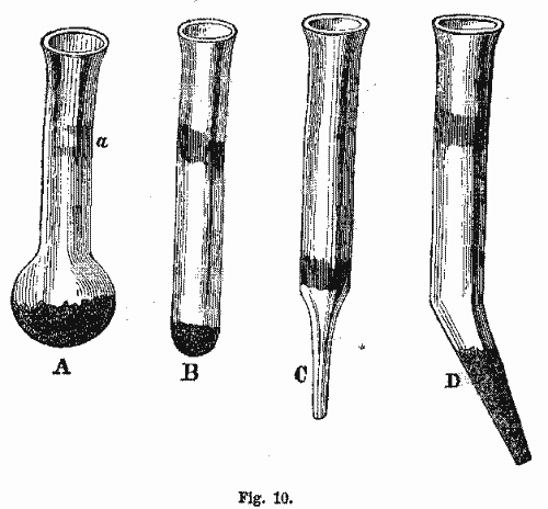 When a substance is to be examined for the purpose of ascertaining whether it contains combustible matter, as sulphur or arsenic, and where we wish to avoid oxidation, we use these tubes without extending the closed end, in order that there may be as little air admitted as possible, as is represented in tube B. But when a substance to be examined is to be tested for water, or other incombustible volatile matters, we employ tubes with little bulbs blown at one end, such as represented at tube A. Here there is room for a circulation of air at the bottom of the tube, by which the volatile matter rises more easily. In some cases, it is necessary to draw the closed end out to a fine point, as in the tubes C and D. Either one or the other of these tubes is employed, depending upon the nature of the substance used. The sublimates condense at the upper part of the tube a, and can be there examined and recognized. These tubes, before being used, must be thoroughly dried and cleaned. In experimenting with them, they should not be exposed at once to the hottest part of the flame, but should be submitted to the heat gradually. If the substance is of such a nature that it will sublime at a low heat, the tube should be held more horizontal, while a higher heat is attained by bringing the tube to a more vertical position.