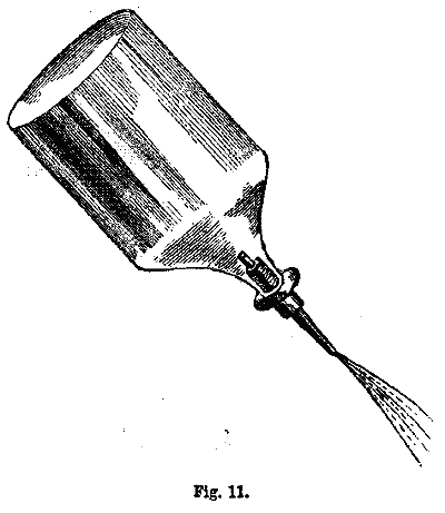 Edulcorator or Washing Bottle.—Take a glass bottle of the capacity of about twelve ounces, and close the mouth of it very tight with a cork, through which a short glass tube is fitted airtight. The external end of this tube is drawn out to a point, with a very fine orifice. The bottle should be filled about half full of water. By blowing air into the bottle through the tube, and then turning it downwards, the compressed air will expel a fine stream of water through the fine orifice with considerable force. We use this washing bottle, Fig. 11, for the purpose of rinsing the small particles of coal from the reduced metals.