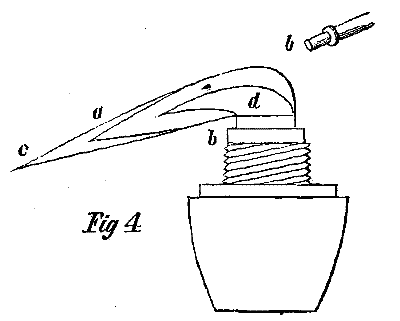 A good reduction flame can be obtained by the use of a small orifice at the point of the blowpipe. In order to produce such a flame, hold the point of the blowpipe higher above the wick, while the nozzle must not enter the flame so far as in the production of the oxidation flame. The point of the blowpipe should only touch the flame, while the current of air blown into it must be stronger than into the oxidation flame. If we project a stream, in the manner mentioned, into the flame, from the smaller side of the wick to the middle, we shall perceive the flame changed to a long, narrow, luminous cone, a b, Fig. 4, the end a of which is enveloped by the same dimly visible blueish colored portion of the flame a, c, which we perceive in the original flame, with its point at c. The portion close above the wick, presenting the dull appearance, is occasioned by the rising gases which have not supplied to them enough oxygen to consume them entirely. The hydrogen is consumed, while the carbon is separated in a state of bright ignition, and forms the internal flame.