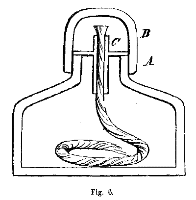 THE SPIRIT-LAMP.—This is a short, strong glass lamp, with a cap, B, Fig. 6, fitted to it by grinding, to prevent the evaporation of the alcohol. The neck a contains a tube C, made of silver, or of tin plate, and which contains the wick. Brass would not answer so well for this tube, as the spirits would oxidize it, and thus impart color to the flame. The wickholder must cover the edge of the neck, but not fit tight within the tube, otherwise, by its expansion, it will break the glass. It is not necessary that alcohol, very highly rectified, should be burnt in this lamp, although if too much diluted with water, enough heat will not be given out. Alcohol of specific gravity 0.84 to 0.86 is the best.