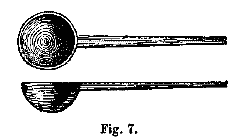 (e.) Platinum Spoon.—When we require to fuse substances with the acid sulphate of potash, or to oxidize them by detonation with nitrate of potash, whereby we wish to preserve the oxide produced, we generally use a little spoon of platinum, about from nine to fifteen millimetres[1] in diameter, and shaped as represented in Fig. 7. The handle of this spoon is likewise of platinum, and should fit into a piece of cork, or be held with the forceps.