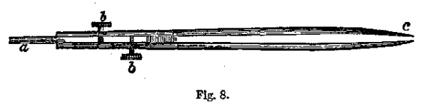 (f.) Platinum Forceps or Tongs.—We frequently are necessitated to examine small splinters of metals or minerals directly in the blowpipe flame. These pieces of metallic substances are held with the forceps or tongs represented as in Fig. 8, where ac is formed of steel, and aa are platinum bars inserted between the steel plates. At bb are knobs which by pressure so separate the platinum bars aa, that any small substance can be inserted between them.