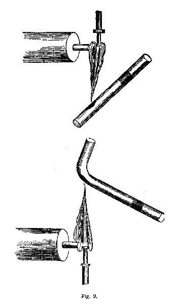 Tubes are of great value in the examination of volatile substances which require oxidizing or roasting, and heating with free access of air. Also to ascertain whether a substance under examination will sublimate volatile matter of a certain appearance. Such substances are selenium, sulphur, arsenic, antimony, and tellurium. These substances condense on a cool part of the tube, and they present characteristic appearances, or they may be recognized by their peculiar smell. These tubes must be made of the best kind of glass, white and difficult of fusion, and entirely free from lead. The substance to be examined must be put in the tube near one end, and exposed to the flame of the blowpipe. The end containing the substance must be held lower than the other end, and must be moved a little over the spirit-lamp before a draught of air is produced through the tube. It is a good plan to have a number of these tubes on hand. After having used a tube we cut off that end of it which contained the substance, with a file, and clean it from the sublimate, either by heating it over the spirit-lamp, or with a piece of paper wound around a wire. It sometimes happens that the substance falls out of the tube before it becomes sufficiently melted to adhere to the glass. To obviate this, we bend the tube not far from the end, at an obtuse angle, and place the substance in the angle, whereby the tube may be lowered as much as necessary. Fig. 9 will give the student a comprehension of the processes described, and of the manner of bending the tubes.