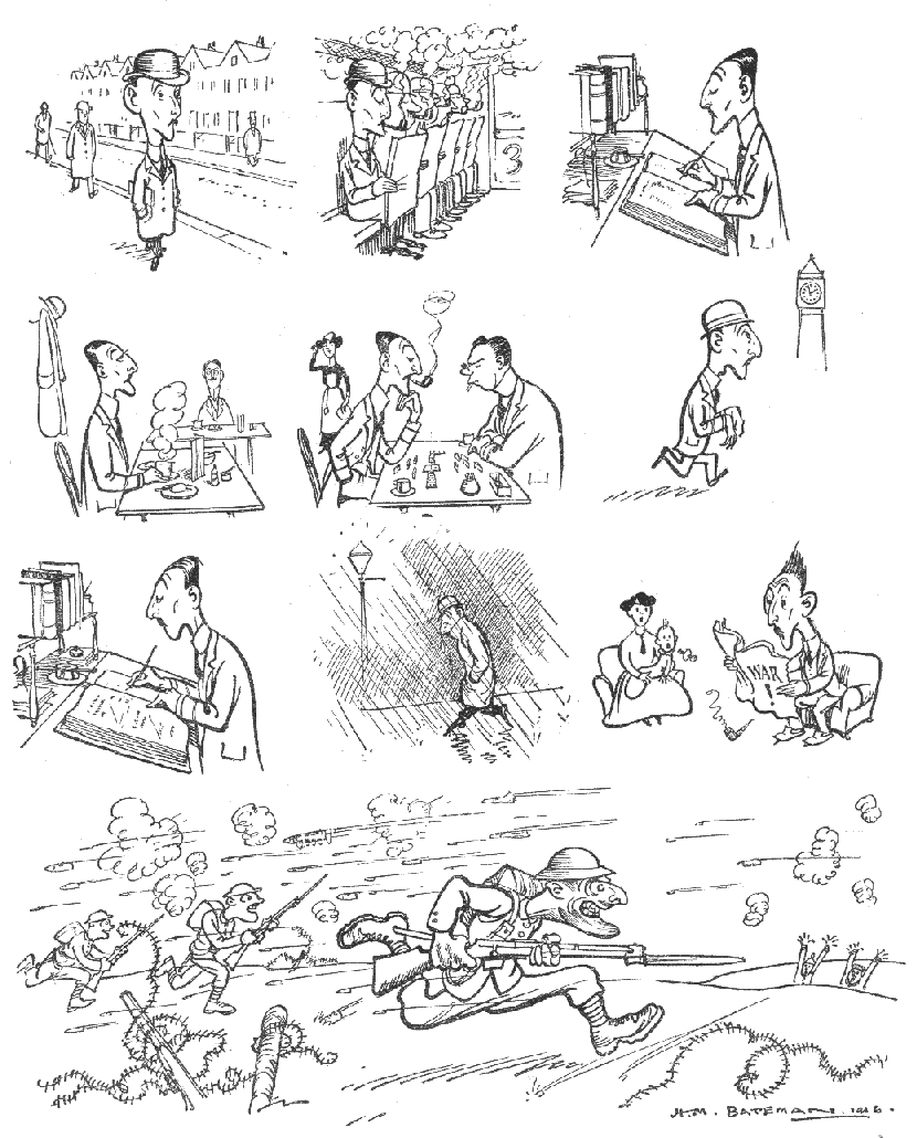 Tea in the dug-out—ten francs. Trips through trenches, accompanied by trained guides reciting selected passages from the outpourings of our special correspondents—ten francs. At night grand S.O.S. rocket and Very light display—ten francs. While for a further twenty francs the tourist will be allowed to pick up as many souvenirs in the way of rolls of barbed wire, dud bombs and blind crumps as he can stagger away with. By this means the country will be cleared of its explosive matter and I shall be able to spend my declining years in Park Lane, or, anyway, Tooting.