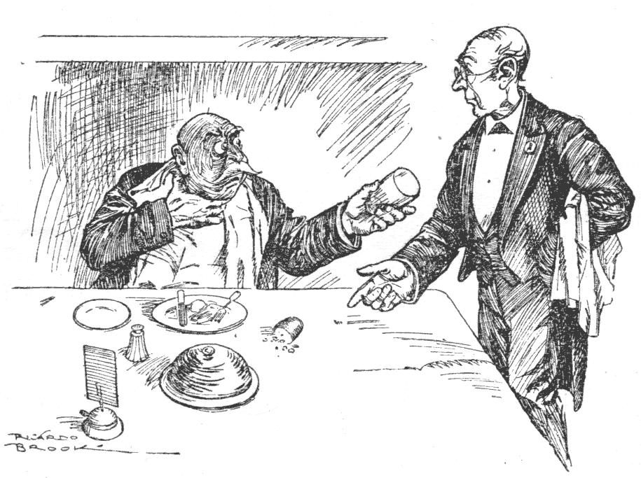 "Acting on orders received from the Controller I am making a series of surprise inspections with a view to discovering the guilty parties, who will be proceeded against under section A, subsection 2, paragraph 1,769 of Part III. of King's Reg's.—I mean, the Defence of the Realm Act. I particularly wish you to understand," I went on ruthlessly, nipping an indignant protest in the bud, "that I do not for a moment allege, suggest or insinuate that you specifically are one of these potato-swindlers; nevertheless I have my duty to do, and I must ask you here and now to lay out your entire stock for inspection."