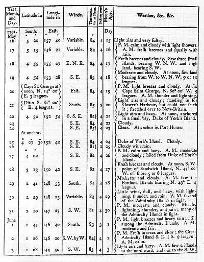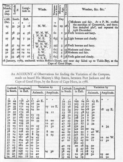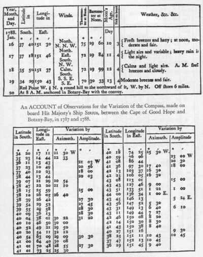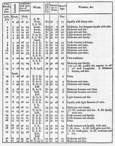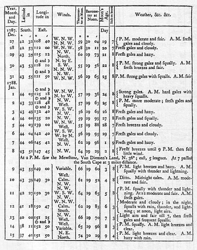 We had light breezes with fair and pleasant weather down the channel, but had the mortification to find that two of our transports sailed exceedingly bad; one of which, the Hyena towed two or three days. On the 15th, at sun-set, the Start Point bore north-east half east by compass, distant seven or eight leagues: at noon on this day (which finishes the nautical and begins the astronomical day) the longitude, by account, was 5°. 01'. west of the meridian of Greenwich, and by a timepiece made by Mr. Kendal, with which the Board of Longitude had supplied us, it was 4°. 59'. west; we had a variety of weather from this time till the 21st. when being in latitude 47°. 52'. north, and longitude 12°. 14'. west, Captain Phillip put his dispatches on board the Hyena; she saluted us with three cheers, and we parted company; the wind was now, and had been for some days before, in the south-west quarter, with hazy weather, our progress to the southward was therefore but slow; much attention was required on our part to the rate of sailing of the different transports, in order to prevent separation.
