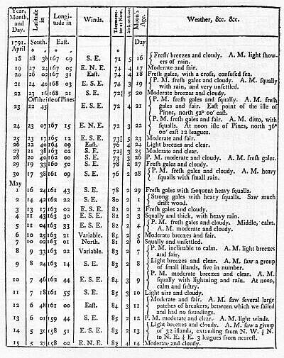 Essence of malt and vinegar were served to the ship's company on the 24th, and every precaution was taken to preserve their health. In the evening, we had much lightning to the northward: the wind blew fresh from the north-east, and we had frequent heavy squalls attended with rain. Towards noon on the 26th, the wind grew light and variable: the latitude was 32° 20' south, and the longitude 311° 02' east. In the evening, we had much lightning to the northward: towards midnight, a fresh breeze sprung up from the south-east.