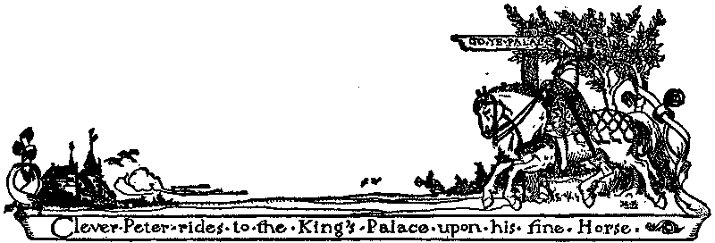 One day a king came riding along the road, and all of his people with him. He looked up and saw the apple hanging in the tree, and a great desire came upon him to have a taste of it. So he called one of the servants to him, and told him to go and ask whether it could be bought for a potful of gold.