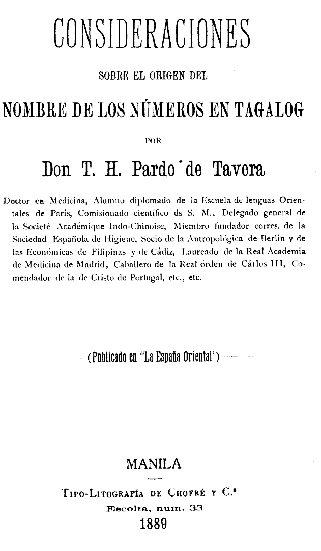 El origen del nombre de los números tagalog es triple: 1.º origen polinesiano, el más antíguo, el de la primera numeración; oceaniano, porque es común á casi todas las lenguas malayo-polinesianas: 2.º orígen própio: 3.º orígen extranjero, árabe ó hebreo (que para mi modesta opinión es lijeramente dudoso) y sanscrito.