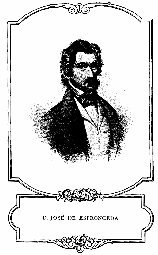Don José de Espronceda y Lara, Spain's foremost lyric poet of the nineteenth century, was born on the 25th of March, 1808, the year of his country's heroic revolt against the tyranny of Napoleon. His parents were Lieutenant-Colonel Don Juan de Espronceda y Pimentel and Doña María del Carmen Delgado y Lara. Both were Andalusians of noble stock, and, as we learn from official documents, were held to be Christians of clean blood "without taint of Jews, heretics, Moors, or persons punished by the Holy Inquisition, and who neither were nor had been engaged in mean or low occupations, but in highly honorable ones." This couple of such highly satisfactory antecedents had been married four years previously. In 1804 Don Juan, a mature widower of fifty-three, was still mourning his first wife when he obtained the hand of Doña María, a young widow whose first husband, a lieutenant in the same regiment, was recently deceased. The marriage was satisfactory in a worldly way, for Doña María brought as a dower four hundred thousand reales to be added to the two hundred thousand which Don Juan already possessed. By his first marriage Don Juan had had a son, Don José de Espronceda y Ramos, who became ensign in his father's regiment, then studied in the Artillery School at Segovia, and later entered the fashionable Guardia de Corps regiment. He died in 1793 at the early age of twenty-one, soon after joining this regiment. By the second marriage there were two other children, both of whom died in infancy: Francisco, born in 1805, and María, born in 1807. During the early months of 1808 the Bourbon cavalry regiment in which Don Juan served was stationed in the little hamlet of Villafranca de los Barros, Estremadura, and there the future poet was born. We do not know where the mother and son found refuge during the stormy years which followed. The father was about to begin the most active period of his career. We learn from his service record that he won the grade of colonel on the field of Bailén; that a year later he recaptured the cannon named Libertad at the battle of Consuegra (a feat which won him the rank of brigadier), and fought gallantly at Talavera as a brother-in-arms of the future Duke of Wellington. The mere enumeration of the skirmishes and battles in which he participated would require much space. In 1811 he distinguished himself at Medina Sidonia and Chiclana, and sought promotion to the rank of field-marshal, which was never granted. After the Peninsular War he seems to have been stationed in Madrid between 1815 and 1818. His family were probably permanently established in that city, for we know that mother and son resided there during the time that the brigadier was doing garrison duty in Guadalajara (1820-1828), and there is no evidence that they followed him to Coruña during his term of service in that city (1818-1820). Possibly the old soldier preferred the freedom of barrack life, where his authority was unquestioned, to the henpecked existence he led at home. "Ella era él y él era ella," says Patricio de Escosura in speaking of this couple; for Doña María was something of a shrew. She was a good business woman who combined energy with executive ability, as she later proved by managing successfully a livery-stable business. But, however formidable she may have been to her hostlers, her son José found her indulgent. He, the only surviving son of a mature couple, rapidly developed into a niño consentido, the Spanish equivalent of a spoiled child. Parallels are constantly being drawn between Byron and Espronceda. It is a curious fact that both poets were reared by mothers who were alternately indulgent and severe.