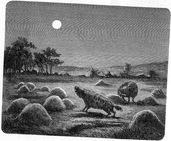 Auf einer der Farmen klagte mir der Eigenthümer über die Dreistigkeit der Hyänen. Eine solche war einige Wochen zuvor Abends, als der Eigenthümer in der Stube saß, in dieselbe eingedrungen. Der Mann, der eben eine holländische Zeitung las, dachte, es sei ein Hund, als ihn sein unter dem Tische liegender Hund, der auf den frechen Eindringling lossprang, eines Anderen belehrte. Auf Pitfontein fanden wir Löwenspuren und die Söhne des Farmers erzählten uns, daß eine der in dem umzäunten Felde arbeitenden Barolong-Dienerinnen zwei Tage zuvor, Früh am Morgen einen Löwen gesehen hätte. Auch war am selben Tage eines ihrer Kälber im »veldt« (auf der Ebene) von einem Löwen getödtet gefunden worden. Nach diesen Mittheilungen zu schließen, mußten es Löwen vom Maretsane- und Konanaspruit gewesen sein, welche vom Westen her ähnliche Besuche diesen Farmen und den wildreichen Ebenen abzustatten pflegten.