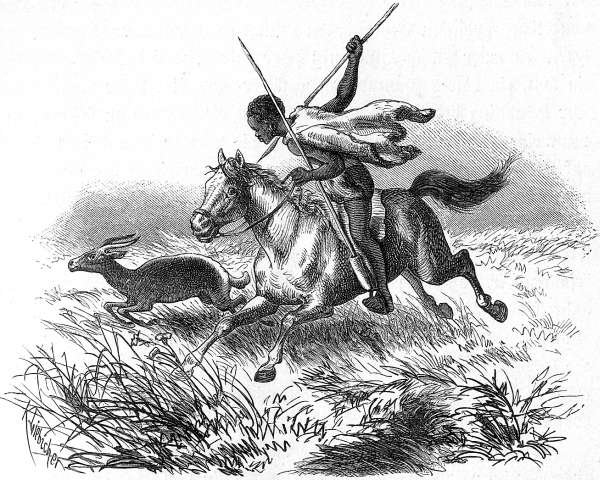 Vorbereitungen und Ausrüstung zur Reise.—Meine diesmaligen Reisegefährten.—Aufbruch von Dutoitspan.—Klipdrift.—Platberg in Gefahr.—Diamantenfund.—Afrikanische Wegmauth.—Hebron.—Wassermangel.—Ein Grasbrand auf der Hochebene.—Hartebeest-Antilopen.—Ein theuerer Labetrunk.—Gassibone's Kraal.—Nigers Abenteuer mit einer Cobra.—Taung.—Ein holländischer Schmied.—Reverend Brown und die Missionsstation in Taung.—Maruma.—Monkey's Freuden und Leiden.—Eine dornenvolle Jagd.—Billige Diamanten.—Von Pavianen genarrt.—Unser Empfang in Musemanjana.