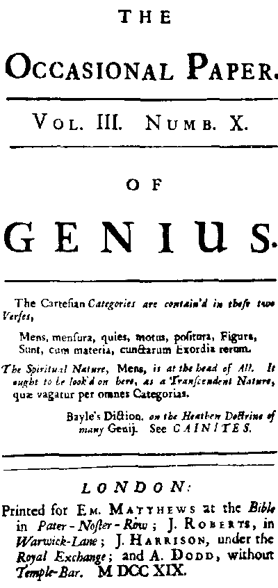 Title: 'Of Genius', in The Occasional Paper, and Preface to The Creation