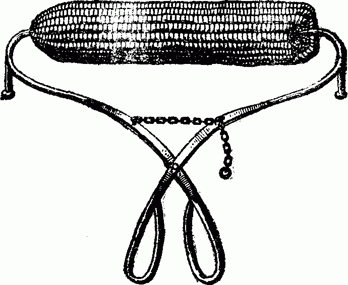 Corn-Holder.—Corn is never so sweet as when it is eaten off the cob, and in spite of burned and greasy fingers too, most people prefer to enjoy it in that way. This corn-holder will enable one to so enjoy it without any such drawbacks. It consists of a pair of lever-arms which work like scissors or shears. One end of each curves inwardly and has a pointed end which will enter the corn. There is a chain below which will keep them fixed in the necessary position for firmly holding it.