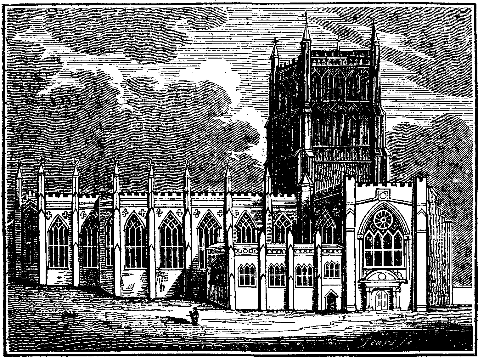 The cathedral of Bristol is one of the most interesting relics of monastic splendour which have been spared from the wrecks of desolation and decay. It is dedicated to the holy and undivided Trinity, and is the remains of an abbey or monastery of great magnificence, which was dedicated to St. Augustine. The erection of this monastery was begun in 1140, and was finished and dedicated in 1148, according to the inscription on the tomb of the founder, Robert Fitzharding, the first lord of Berkeley, who, together with others of that illustrious family, are enshrined within these walls. It was also denominated the monastery of the black regular canons of the order of Saint Victor, who are mentioned by Leland as the black canons of St. Augustine within the city walls. By some historians, Fitzharding is represented as an opulent citizen of Bristol; but generally as a younger son or grandson of the king of Denmark, and as the youthful companion of Henry II., who, betaking himself from the sunshine of royal friendship, became a canon of the monastery he himself had founded. In this congenial solitude he died in 1170, aged 75. Such is the outline of the foundation of this structure, and it is one of the most attractive episodes of the early history of England; for the circumstance of a noble exchanging the gilded finery of a court, and the gay companionship of his prince, for the gloomy cloisters of an abbey, and the ascetic duties of monastic life, bespeaks a degree of resolution and self-control which was more probably the result of sincere conviction than of momentary caprice.