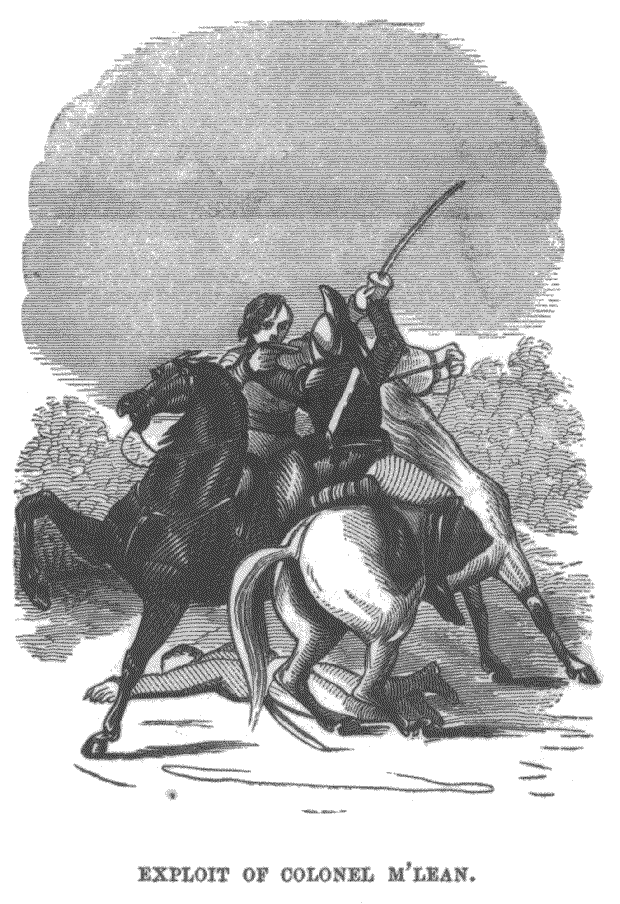 "Having agreed, for some purpose, to rendezvous near Shoemakertown, Col. M'Lean ordered his little band of troopers to follow at some distance, and commanded two of them to precede the main body, but also to keep in his rear; and if they discovered an enemy, to ride up to his side and inform him of it, without speaking aloud. While leisurely approaching the place of rendezvous in this order, in the early gray of the morning, the two men directly in his rear, forgetting their orders, suddenly called out, 'Colonel, the British!' faced about, and putting spurs to their horses, were soon out of sight. The colonel, looking around, discovered that he was in the centre of a powerful ambuscade, into which the enemy had silently allowed him to pass, without his observing them. They lined both sides of the road, and had been stationed there to pick up any straggling party of the Americans that might chance to pass. Immediately on finding they were discovered, a file of soldiers rose from the side of the highway, and fired at the colonel, but without effect; and as he put spurs to his horse, and mounted the road-side into the woods, the other part of the detachment also fired. The colonel miraculously escaped; but a shot striking his horse upon the flank, he dashed through the woods, and in a few minutes reached a parallel road upon the opposite side of the forest. Being familiar with the country, he feared to turn to the left, as that course led to the city, and he might be intercepted by another ambuscade. Turning, therefore, to the right, his frightened horse carried him swiftly beyond the reach of those who had fired upon him. All at once, however, on emerging from a piece of woods, he observed several British troopers stationed near the road-side, and directly in sight ahead, a farm-house, around which he observed a whole troop of the enemy's cavalry drawn up. He dashed by the troopers near him without being molested, they believing he was on his way to the main body to surrender himself. The farm-house was situated at the intersection of two roads, presenting but a few avenues by which he could escape Nothing daunted by the formidable array before him, he galloped up to the cross-roads, on reaching which, he spurred his active horse, turned suddenly to the right, and was soon fairly out of reach of their pistols, though as he turned he heard them call loudly to surrender or die! A dozen were instantly in pursuit; but in a short time they all gave up the chase except two. Colonel M'Lean's horse, scared by the first wound he had ever received, and being a chosen animal, kept ahead for several miles, while his two pursuers followed with unwearied eagerness. The pursuit at length waxed so hot, as the colonel's horse stepped out of a small brook which crossed the road, his pursuers entered it at the opposite margin. In ascending a little hill, the horses of the three were greatly exhausted, so much so that neither could be urged faster than a walk. Occasionally, as one of the troopers pursued on a little in advance of his companion, the colonel slackened his pace, anxious to be attacked by one of the two; but no sooner was his willingness discovered, than the other fell back to his station. They at length approached so near, that a conversation took place between them; the troopers calling out, 'Surrender, you damn'd rebel, or we'll cut you in pieces!' Suddenly one of them rode up on the right side of the colonel, and, without drawing his sword, laid hold of the colonel's collar. The latter, to use his own words, 'had pistols which he knew he could depend upon.' Drawing one from the holster, he placed it to the heart of his antagonist, fired, and tumbled him dead on the ground. Instantly the other came on his left, with his sword drawn, and also seized the colonel by the collar of his coat. A fierce and deadly struggle here ensued, in the course of which Col. M'Lean was desperately wounded in the back of his left hand, the sword of his antagonist cutting asunder the veins and tendons. Seizing a favourable opportunity, he drew his other pistol, and with a steadiness of purpose which appeared even in his recital of the incident, placed it directly between the eyes of his adversary, pulled the trigger, and scattered his brains on every side of the road! Fearing that others were in pursuit, he abandoned his horse in the highway: and apprehensive, from his extreme weakness, that he might die from loss of blood, he crawled into an adjacent mill-pond, entirely naked, and at length succeeded in stopping the profuse flow of blood occasioned by his wound. Soon after, his men came to his relief. Now, I think, Mr. Pitts, your hero was at least equalled in Col. M'Lean."