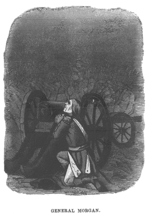 "This 'thunderbolt of war,' this 'brave Morgan, who never knew fear,' was, in camp, often wicked and very profane, but never a disbeliever in religion. He testified that himself. In his latter years General Morgan professed religion, and united himself with the Presbyterian church in Winchester, Va., under the pastoral care of the Rev. Dr. Hill, who preached in that house some forty years, and may now be occasionally heard on Loudon Street, Winchester. His last days were passed in that town; and while sinking to the grave, he related to his minister the experience of his soul. 'People thought,' said he, 'that Daniel Morgan never prayed;'—'People said old Morgan never was afraid;'—'People did not know.' He then proceeded to relate in his blunt manner, among many other things, that the night they stormed Quebec, while waiting in the darkness and storm, with his men paraded, for the word 'to advance,' he felt unhappy; the enterprise appeared more than perilous; it seemed to him that nothing less than a miracle could bring them off safe from an encounter at such an amazing disadvantage. He stepped aside and kneeled by the side of a cannon—and then most fervently prayed that the Lord God Almighty would be his shield and defence, for nothing less than an almighty arm could protect him. He continued on his knees till the word passed along the line. He fully believed that his safety during that night of peril was from the interposition of God. Again, he said, about the battle of the Cowpens, which covered him with so much glory as a leader and a soldier—he had felt afraid to fight Tarleton with his numerous army flushed with success—and that he retreated as long as he could—till his men complained—and he could go no further. Drawing up his army in three lines, on the hill side; contemplating the scene—in the distance the glitter of the advancing enemy—he trembled for the fate of the day. Going to the woods in the rear, he kneeled in an old tree-top, and poured out a prayer to God for his army, and for himself, and for his country. With relieved spirits he returned to the lines, and in his rough manner cheered them for the fight; as he passed along, they answered him bravely. The terrible carnage that followed the deadly aim of his lines decided the victory. In a few moments Tarleton fled. 'Ah,' said he, 'people said old Morgan never feared;'—'they thought Morgan never prayed; they did not know;'—'old Morgan was often miserably afraid.' And if he had not been, in the circumstances of amazing responsibility in which he was placed, how could he have been brave?"