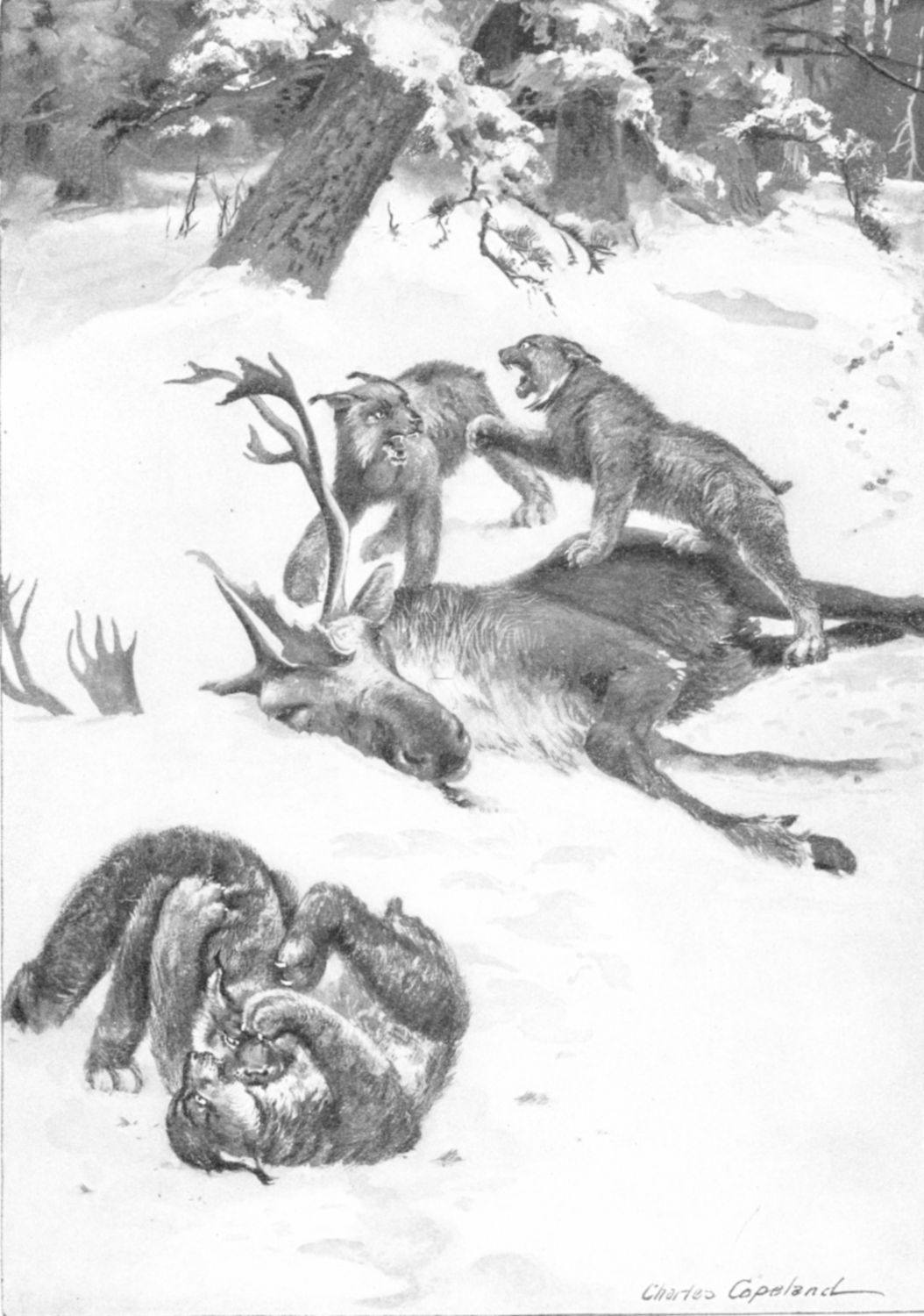 The lucivee tracks now showed different tactics. They crossed and crisscrossed the trail, appearing now in front, now behind, now on either side the wounded bull, evidently closing in upon him warily. Here and there was a depression in the snow where one had crouched, growling, as the game passed. Then the struggle began. First, there was a trampled place in the snow where the bull had taken a stand and the big cats went creeping about him, waiting for a chance to [121] spring all together. He broke away from that, but the three-legged gallop speedily exhausted him. Only when he trots is a caribou tireless. The lynxes followed the deadly cat-play began again. First one, then another leaped, only to be shaken off; then two, then all five were upon the poor brute, which still struggled forward. The record was written red all over the snow.