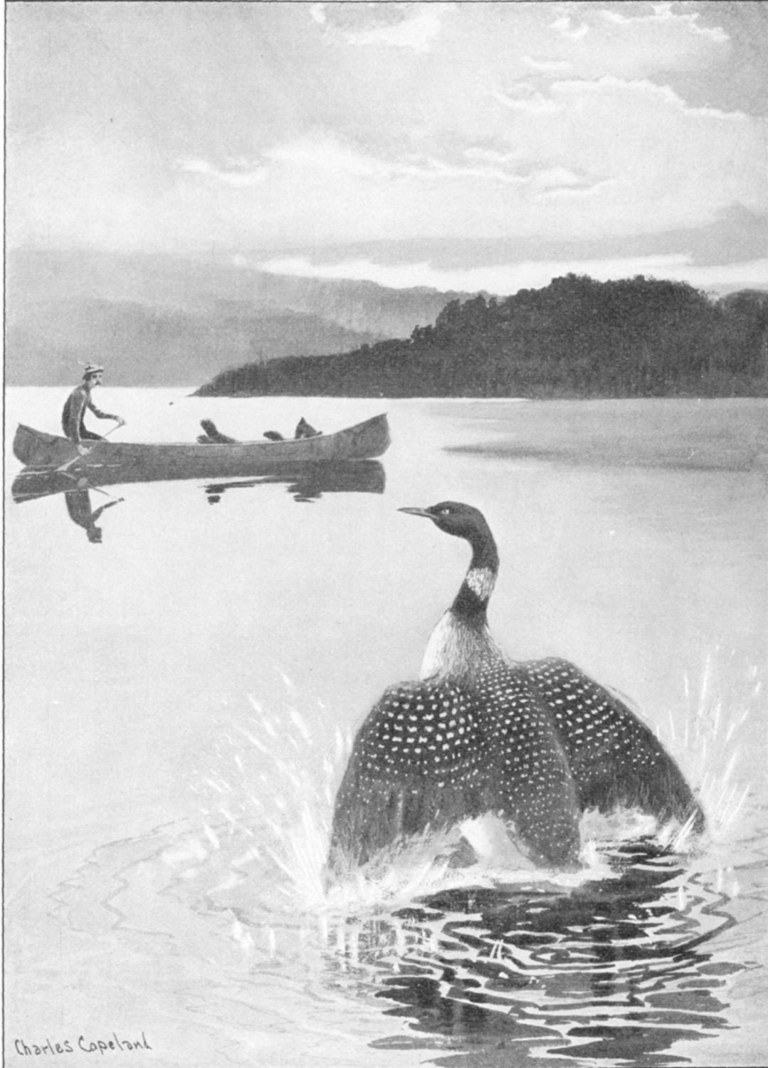 A little later in the fall I saw those same loons do an astonishing thing. For several evenings they had been keeping up an unusual racket in a quiet bay, out of sight of my camp. I asked Simmo what he thought they were doing.—"O, I don' know, playin' game, I guess, jus' like one boy. Hukweem do dat sometime, wen he not hungry," said Simmo, going on with his bean-cooking. That excited my curiosity; but when I reached the bay it was too dark to see what they were playing.