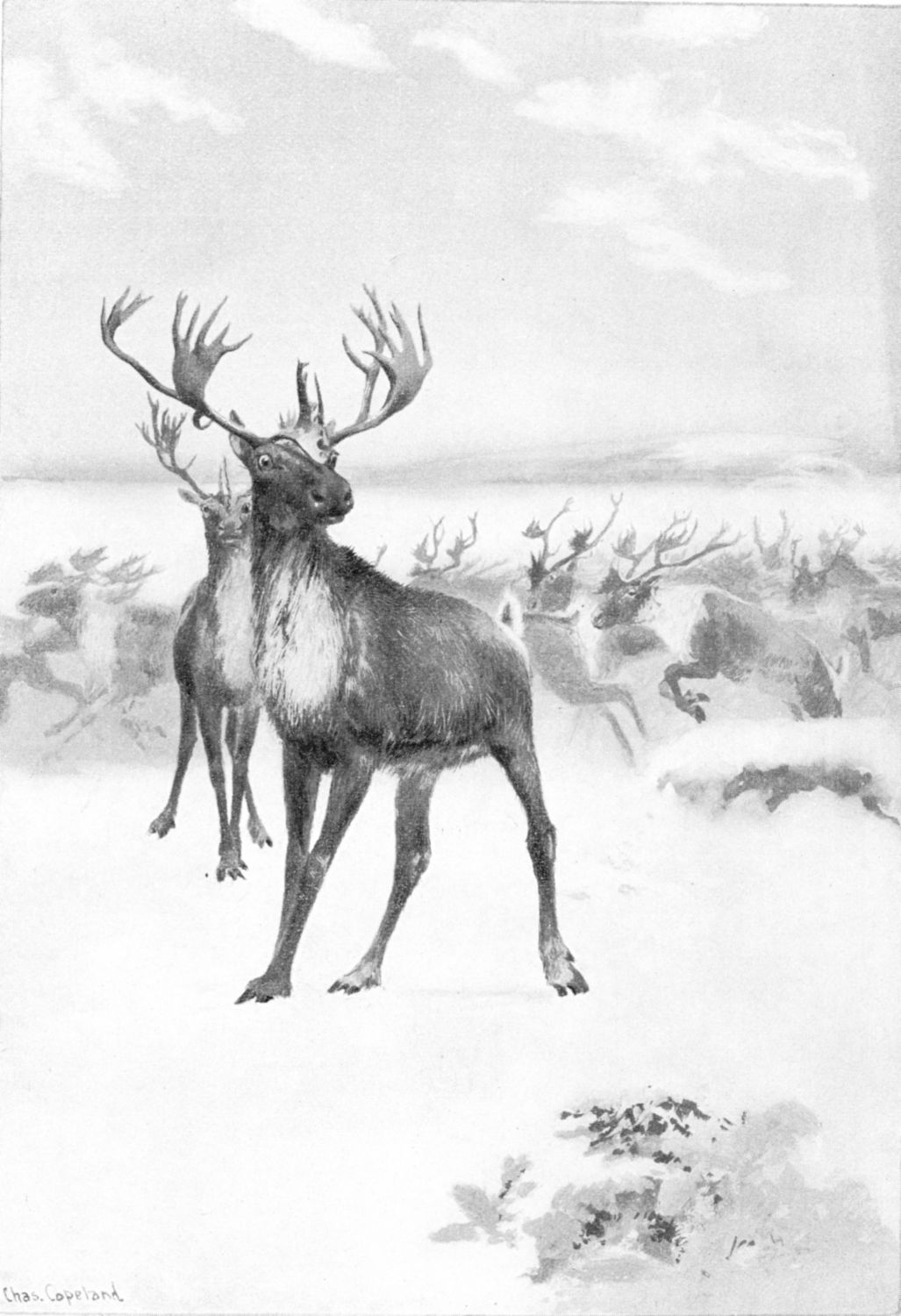 Megaleep in a storm is a most curious creature, the nearest thing to a ghost to be found in the woods. More than other animals he feels the falling barometer. His movements at such times drive you to desperation, if you are following him; for he wanders unceasingly. When the storm breaks he has a way of appearing suddenly, as if he were seeking you, when by his trail you thought him miles ahead. And the way he disappears—just melts into the thick driving flakes and the shrouded trees—is most uncanny. Six or seven caribou once played hide-and-seek with me that way, giving me vague glimpses here and there, drawing near to get my scent, yet keeping me looking up wind into the driving snow where I could see nothing distinctly. And all the while they drifted about like so many huge flakes of the storm, watching my every movement, seeing me perfectly.