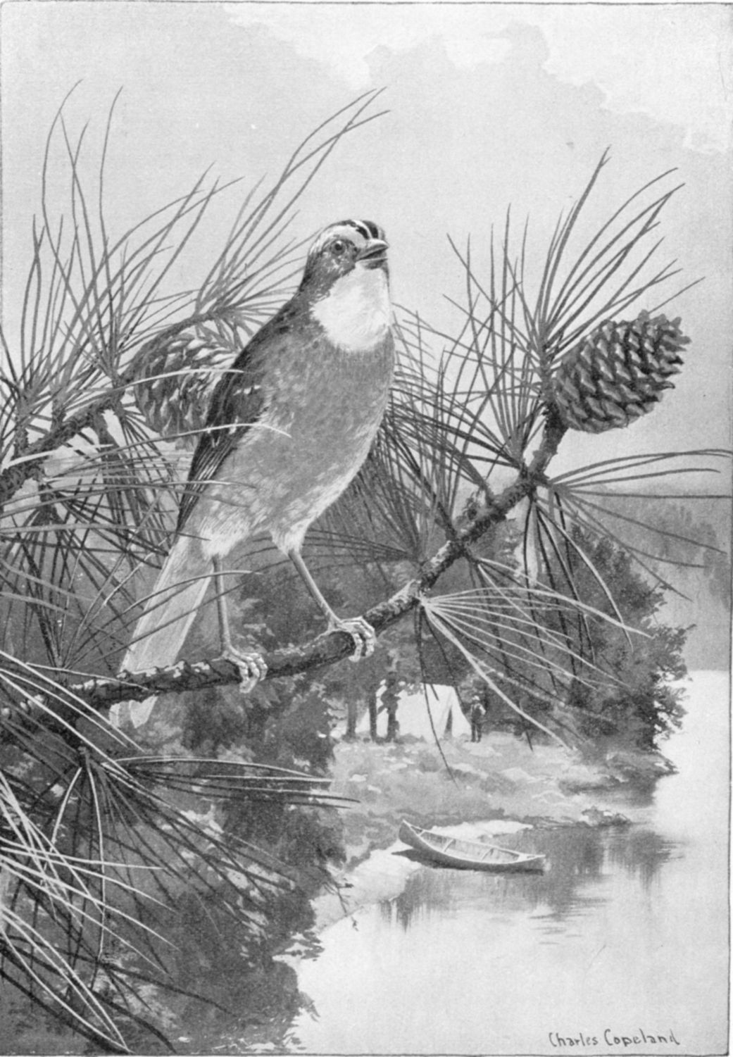 The rain was still falling, and the lake white-capped, and the forest all misty and wind-blown when we ran our canoes ashore by the old cedar that marked our landing place. First we built a big fire to dry some boughs to sleep upon; then we built our houses, Simmo a bark commoosie, and I a little tent; and I was inside, getting dry clothes out [27] of a rubber bag, when I heard a white-throated sparrow calling cheerily his Indian name, O hear, sweet Killooleet-lillooleet-lillooleet! And the sound was so sunny, so good to hear in the steady drip of rain on the roof, that I went out to see the little fellow who had bid us welcome to the wilderness.