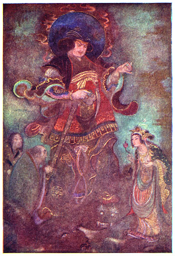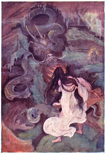 Bij de gewone tegenstrijdigheid van mythen en legenden, [9]behoeft het ons niet te verbazen, dat nergens meer eenige melding wordt gemaakt van het leven van Susa-no-o in het Land van Yomi. Als wij hem weer terugzien, is het buiten eenig verband met zijn gewonen, boosaardigen aanleg. Wij vinden hem juist terug in een rol, die de Ridders van de Ronde Tafel waardig is. Wij zijn volkomen in onzekerheid, of zijn plotseling optreden als dolende ridder een listige zet van zijn kant was met het oog op latere plannen, dan wel of het plotselinge verdwijnen van zijn zuster uit den Hemel hem er toe geleid heeft, voor goed zijn wijze van handelen te veranderen.