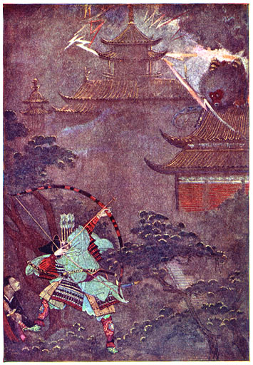 Japan is een bergachtig land, en in zulke landen verwachten wij een ras te zullen vinden van onverschrokken, dappere mannen, en het land der Rijzende Zon heeft ons dan ook menigen krijgsman geschonken, waardig gerangschikt te worden naast de Ridders van Koning Arthur. Meer dan één legende verhaalt van de vernietiging van duivels en booze geesten, en van de bevrijding van meisjes, die het ongeluk hadden hun gevangenen te zijn. De ééne held doodt een groot monster, dat op het dak van het paleis des Keizers neerhurkte, een ander doodt den Boozen Geest van Oyeyama, een ander stoot zijn zwaard in een reusachtige spin, weer een ander verslaat een slang. Alle Japansche helden, in welke onderneming zij ook betrokken zijn, vertoonen dien geest van avontuurlijkheid, die getrouwheid aan een eenmaal gekozen doel, die koele minachting voor gevaar en dood, die nog steeds ook in onzen tijd karakteristieke eigenschappen zijn van het Japansche volk. [XVII]