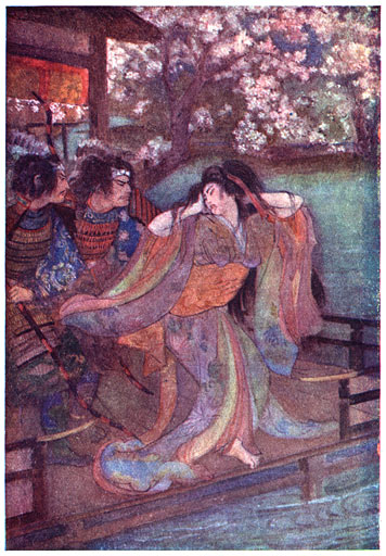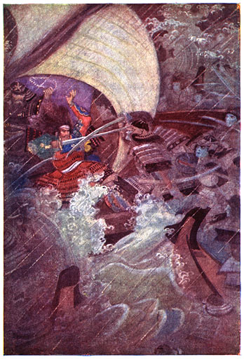 Toen Yoshitsune en Benkei aan het hoofd van het leger van Minamoto de Taira totaal verslagen hadden in het zeegevecht van Dano-Ura, wekte de schitterende overwinning de afgunst op van den Shōgun, zoodat de twee groote veldheeren genoodzaakt waren, het land te verlaten. Wij volgen hen over de zee, over bergen, voortdurend hun talrijke vijanden verschalkend. Bij Matsue werd een groot leger uitgezonden tegen die ongelukkige strijders. De vuren der legerplaatsen strekten zich in een schitterende rij uit over de laatste plaats, waar Yoshitsune [XVI]en Benkei nog rust vonden. In een vertrek was Yoshitsune met zijn vrouw en jeugdig kind. De Dood stond in het vertrek gereed, en het was beter, dat de Dood zou komen op bevel van Yoshitsune, dan op bevel van den vijand buiten de deur. Zijn kind werd door een bediende gedood, en terwijl hij het hoofd van zijn geliefde vrouw onder den linkerarm nam, stootte hij zijn zwaard diep in haar nek. Na dit te hebben volbracht, pleegde Yoshitsune zelfmoord (hara-kiri).3 Benkei echter wachtte den vijand op. Hij stond met zijn groote beenen wijd uitgespreid, zijn rug tegen een rots gedrukt. Toen de dageraad aanbrak, stond hij nog altijd met uitgespreide beenen, terwijl zijn dapper lichaam door duizend pijlen was doorboord. Benkei was dood, maar vallen kon de krachtige held niet. De zon verrees over een man, die een ware held was, en die steeds getrouw was gebleven aan de eenmaal door hem uitgesproken woorden: “Waar mijn meester heengaat, hetzij ter overwinning, of in den dood, ik zal hem volgen.”