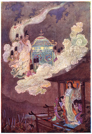 Het geween van Mindere-glans-Prinses bereikte den Hemel, immers zij had haar echtgenoot innig lief en herkende in zijn plotselingen dood volstrekt niet de rechtvaardige wraak der Goden. Zij weende zóó luide en zóó hartverscheurend, dat de Hemelsche Goden haar hoorden. [12]Een krachtige wind daalde neer, die het lichaam van Ame-waka naar de Hooge Vlakte van den Hemel heendreef. Een doodenhuis werd gemaakt, waarin de overledene gelegd werd. Gedurende acht dagen en acht nachten weerklonk het gejammer en het geween. De wilde gans in de rivier, de reiger, de ijsvogel, de musch en de fazant treurden met groote droefenis.