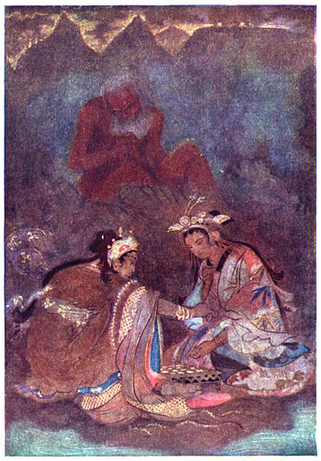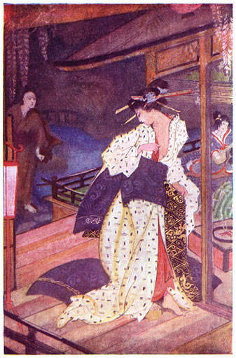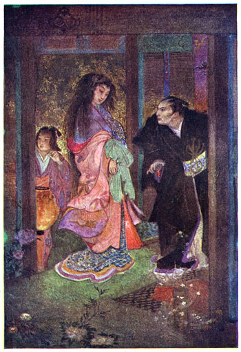 Hoori trouwde daarop met de dochter van den Zeegod, Toyo-tama (“Rijk-Juweel”), en zij leefden samen in het paleis onder de zee. Gedurende drie jaren ging alles best, maar daarna kreeg Hoori heimwee, en wilde hij zoo gaarne een blik slaan op zijn land, misschien ook herinnerde hij zich, dat hij den vischhaak nog aan zijn broeder moest teruggeven. Deze volstrekt niet onnatuurlijke gedachten verontrustten het hart van de liefhebbende Toyo-tama, en zij ging naar haar vader, om hem de reden van haar droefheid mede te deelen. Maar de Zeegod, die altijd wellevend [17]en hoffelijk was, nam het gedrag van zijn schoonzoon volstrekt niet kwalijk. Integendeel, hij gaf hem den vischhaak en zeide: “Als gij dezen vischhaak aan uw ouderen broeder geeft, zeg dan tegen dien vischhaak heimelijk: ‘Een ongelukkige vischhaak!’” Evenzoo schonk hij Hoori den Juweel van het Stijgende Water en dien van het Vallende Water en zeide: “Als gij den Juweel van het Stijgende Water onderdompelt, zal het water plotseling wassen, en zult gij uw ouderen broeder onder water doen zinken. Maar voor het geval uw oudere broeder berouw heeft en vergiffenis vraagt, zal, als gij den Juweel van het Vallende Water onderdompelt, het water plotseling dalen, en zult gij hem dus redden. Indien gij hem op die manier bejegent, zal hij zich uit eigen beweging onderwerpen.”