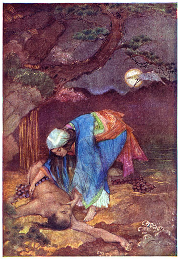 De Onstuimige Jongeling luisterde met de grootste aandacht naar dit droevige verhaal, en daar hij zag, dat het meisje bijzonder schoon was, bood hij zich aan, om de [10]achttakkige slang te dooden, als haar ouders haar hem ten huwelijk wilden geven als een passende belooning voor zijn diensten. Dit verzoek werd bereidwillig toegestaan.