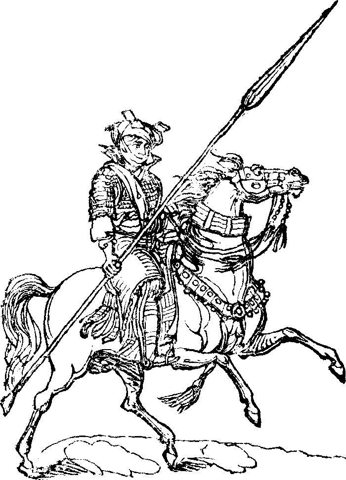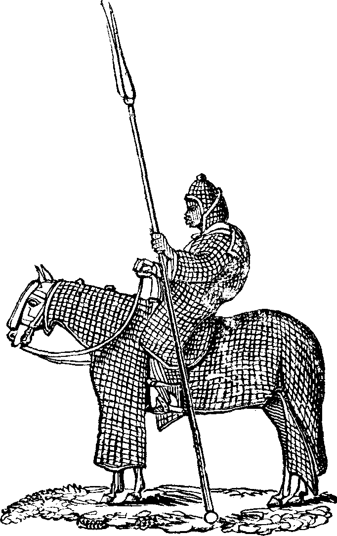 The second engraving, copied from the same authentic source as that preceding it, is a somewhat grotesque portraiture of one of the Lancers of the Sultan of Begharmi, described, in an historical and geographical account by a native prince, as an extensive country, containing woods and rivers, and fields fit for cultivation; but now desolated, as the inhabitants say, by the "misconduct of the king, who, having increased in levity and licentiousness to such a frightful degree, as even to marry his own daughter, God Almighty [pg 298] caused Saboon, the prince of Wa-da-i, to march against him, and destroy him, laying waste, at the same time, all his country, and leaving the houses uninhabited, as a signal chastisement for his impiety."