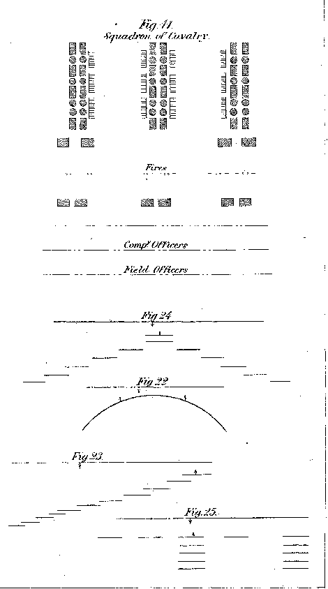 Fig. 11 is the camp of a squadron of cavalry. A single company encamping alone, would be arranged in the same way as an entire squadron. The horses are picketed in two lines parallel to the tents, and at a distance from them of about 12 feet. The forage is placed between the tents. A squadron of two companies will occupy a front of about 180 feet. The fires, or company kitchens, should be 50 or 60 feet in rear of the non-commissioned officers' tents.