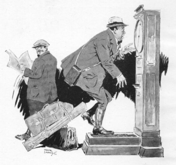 In the fall of the year, when I brought last winter's heavy suit out of the clothes-press and found it now to hug o'ersnugly for comfort, I cajoled my saner self into accepting a most transparent lie—my figure had not materially altered through the intervening spring and summer; it was only that the garments, being fashioned of a shoddy material, had shrunk. I owned a dress suit which had been form fitting, 'tis true, but none too close a fit upon me. I had owned it for years; I looked forward to owning and using it for years to come. I laid it aside for a period during an abatement in formal social activities; then bringing it forth from its camphor-ball nest for a special occasion I found I could scarce force my way down into the trousers, and that the waistcoat buttons could not be made to meet the buttonholes, and that the coat, after finally I had struggled into it, bound me as with chains by reason of the pull at armpits and between the shoulders. I could not get my arms down to my sides at all. I could only use them flapper fashion.