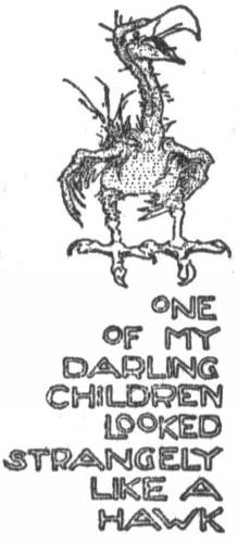 One of the children looked like a hawk"Twelve of them were as yellow and fluffy as any mother could wish. But the one that came from the strange egg was black and awkward, and had a large bill and sharp claws. Still thinking he was one of my children, despite his deformity, I gave him as much care as any of them, and soon he outgrew the others and became very big and strong.