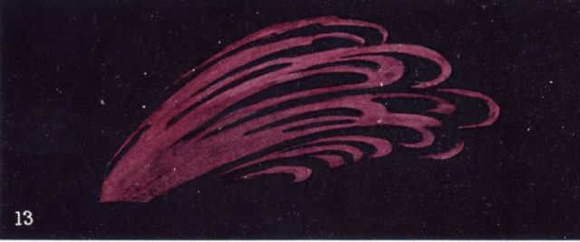 The two sets of four lines which seem to cross one another are caused by two sections of the melody; the scalloped edging surrounding the whole is the result of various flourishes and arpeggios, and the floating crescents in the centre represent isolated or staccato chords. Naturally the arpeggios are not wholly violet, for each loop has a different hue, but on the whole they approach more nearly to that colour than to any other. The height of this form above the tower of the church is probably a little over a hundred feet; but since it also extends downwards through the roof of the church its total perpendicular diameter may well be about a hundred and fifty feet. It is produced by one of Mendelssohn's "Lieder ohne Wörte," and is characteristic of the delicate filigree-work which so often appears as the result of his compositions.