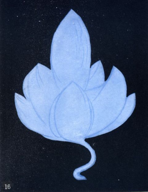 The Sevenfold Manifestation.—In all religions there remains some tradition of the great truth that the Logos manifests Himself through seven mighty channels, often regarded as minor Logoi or great planetary Spirits. In the Christian scheme they appear as the seven great archangels, sometimes called the seven spirits before the throne of God. The figure numbered 47 shows the result of the effort to meditate upon this method of divine manifestation. We have the golden glow in the centre, and also (though with lesser splendour) pervading the form. The line is blue, and it draws a succession of seven graceful and almost featherlike double wings which surround the central glory and are clearly intended as a part of it. As the thought strengthens and expands, these beautiful wings change their colour to violet and become like the petals of a flower, and overlap one another in an intricate but exceedingly effective pattern. This gives us a very interesting glimpse into the formation and growth of these shapes in higher matter.