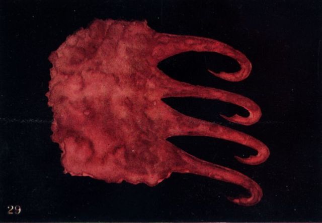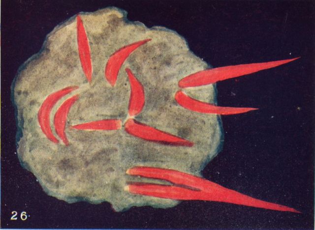 Greed for Drink.—In Fig. 29 we have another variant of the same passion, perhaps at an even more degraded and animal level. This specimen was taken from the astral body of a man just as he entered at the door of a drinking-shop; the expectation of and the keen desire for the liquor which he was about to absorb showed itself in the projection in front of him of this very unpleasant appearance. Once more the hooked protrusions show the craving, while the colour and the coarse mottled texture show the low and sensual nature of the appetite. Sexual desires frequently show themselves in an exactly similar manner. Men who give birth to forms such as this are as yet but little removed from the animal; as they rise in the scale of evolution the place of this form will gradually be taken by something resembling that shown in Fig. 13, and very slowly, as development advances, that in turn will pass through the stages indicated in Figs. 9 and 8, until at last all selfishness is cast out, and the desire to have has been transmuted into the desire to give, and we arrive at the splendid results shown in Figs. 11 and 10.