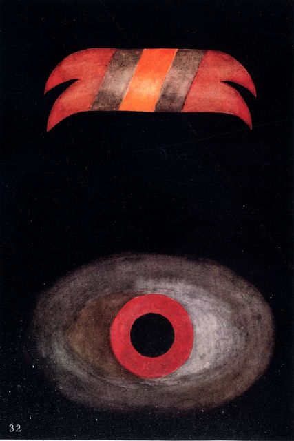 The Gamblers.—The forms shown in Fig. 32 were observed simultaneously at the great gambling-house at Monte Carlo. Both represent some of the worst of human passions, and there is little to choose between them; although they represent the feelings of the successful and the unsuccessful gambler respectively. The lower form has a strong resemblance to a lurid and gleaming eye, though this must be simply a coincidence, for when we analyse it we find that its constituent parts and colours can be accounted for without difficulty. The background of the whole thought is an irregular cloud of deep depression, heavily marked by the dull brown-grey of selfishness and the livid hue of fear. In the centre we find a clearly-marked scarlet ring showing deep anger and resentment at the hostility of fate, and within that is a sharply outlined circle of black expressing the hatred of the ruined man for those who have won his money. The man who can send forth such a thought-form as this is surely in imminent danger, for he has evidently descended into the very depths of despair; being a gambler he can have no principle to sustain him, so that he would be by no means unlikely to resort to the imaginary refuge of suicide, only to find on awakening into astral life that he had changed his condition for the worse instead of for the better, as the suicide always does, since his cowardly action cuts him off from the happiness and peace which usually follow death.