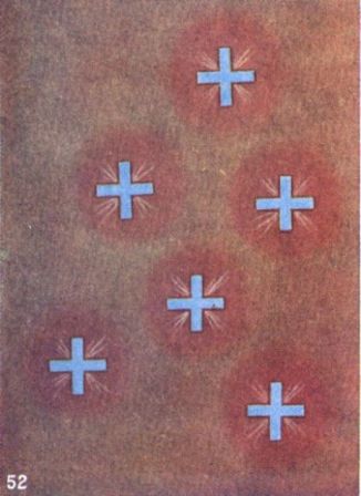 "In the coloured drawings appended the blue features appear to have represented the more devotional element of the thought. The yellow forms accompanied the endeavour to communicate intellectual fortitude, or mental strength and courage. The rosy pink appeared when the thought was blended with affectionate sympathy. If the sender (A.) could formulate his thought deliberately at the appointed time, the receiver (B.) would report seeing a large clear form as in Figs. 48, 49, and 54. The latter persisted for some minutes, constantly streaming its luminous yellow 'message' upon B. If, however, A. was of necessity experimenting under difficulty—say walking out of doors—he would occasionally see his 'forms' broken up into smaller globes, or shapes, such as 50, 51, 52, and B. would report their receipt so broken up. In this way many details could be checked and compared as from opposite ends of the line, and the nature of the influence communicated offered another means of verification. Upon one occasion A. was disturbed in his endeavour to send a thought of the blue-pink connotation, by a feeling of anxiety that the nature of the pink element should not be misapprehended. The report of B. was that a well-defined globe as in Fig. 54 was first seen, but that this suddenly disappeared, being replaced by a moving procession of little light-green triangles, as in Fig. 53. These few drawings give but a slight idea of the varied flower-like and geometric forms seen, while neither paint nor crayon-work seems capable of representing the glowing beauty of their living colours."