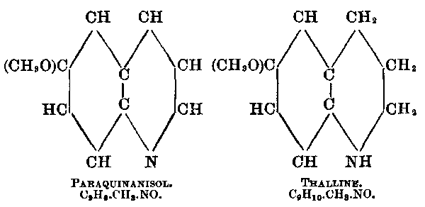Among the most complex alkaloids are those of the quinine group. As yet chemists have got no further with these than the oxidation products; but the study has afforded us several new antipyretics and many interesting facts. It has been found, for example, that artificial quinine-like bodies, which fluoresce and give the green color with chlorine water and ammonia, have antipyretic properties like quinine, but their secondary effects are so pernicious as to prevent their use. If, however, such bodies are hydrogenized or methylated they lose their fluorescing property, do not give the green color, and their secondary effects are removed. Knowledge of these facts led to the discovery of thalline. It is prepared from paraquinanisol, one of the objectionable bodies, by reduction with tin and hydrochloric acid. The following formulæ show the constitutional relationship of these compounds: