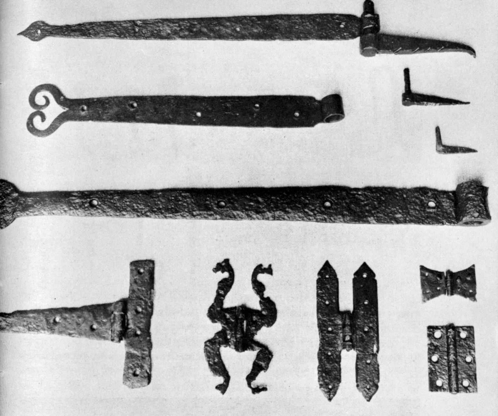 While some of the handwrought hardware found at Jamestown was made in the colony, most of it was imported from England. Types of building hardware unearthed include an excellent assortment of nails, spikes, staples, locks, keys, hinges, pintles, shutter fasteners, bolts, hasps, latches, door knockers, door pulls, footscrapers, gutter supports, wall anchors, and ornamental hardware. In many instances each type is represented by several varieties. Citing 2 examples, there are more than 20 kinds of nails and at least 15 different kinds of hinges in the collection.