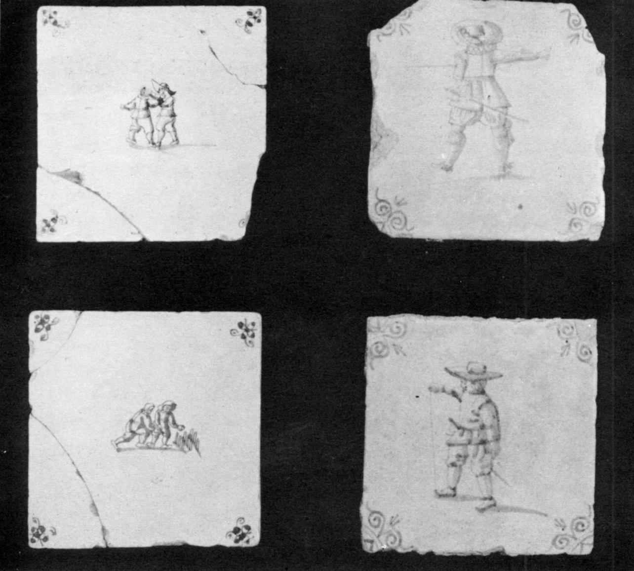 Most of the hand-painted tiles used at Jamestown (for decorating walls and fireplaces) were imported from Holland. A few were made in England. Made of a light-buff clay, and known as delftware, the tiles unearthed are decorated in blue, with a conventionalized design in each corner and a central picture or motif. Covered with a tin glaze, the majority of tiles found measure about 5 inches square by 3/8-inch thick. The edges are beveled, permitting them to be set very close together at the glazed surface. The attractively decorated tiles added a touch of beauty to a few Jamestown interiors.
