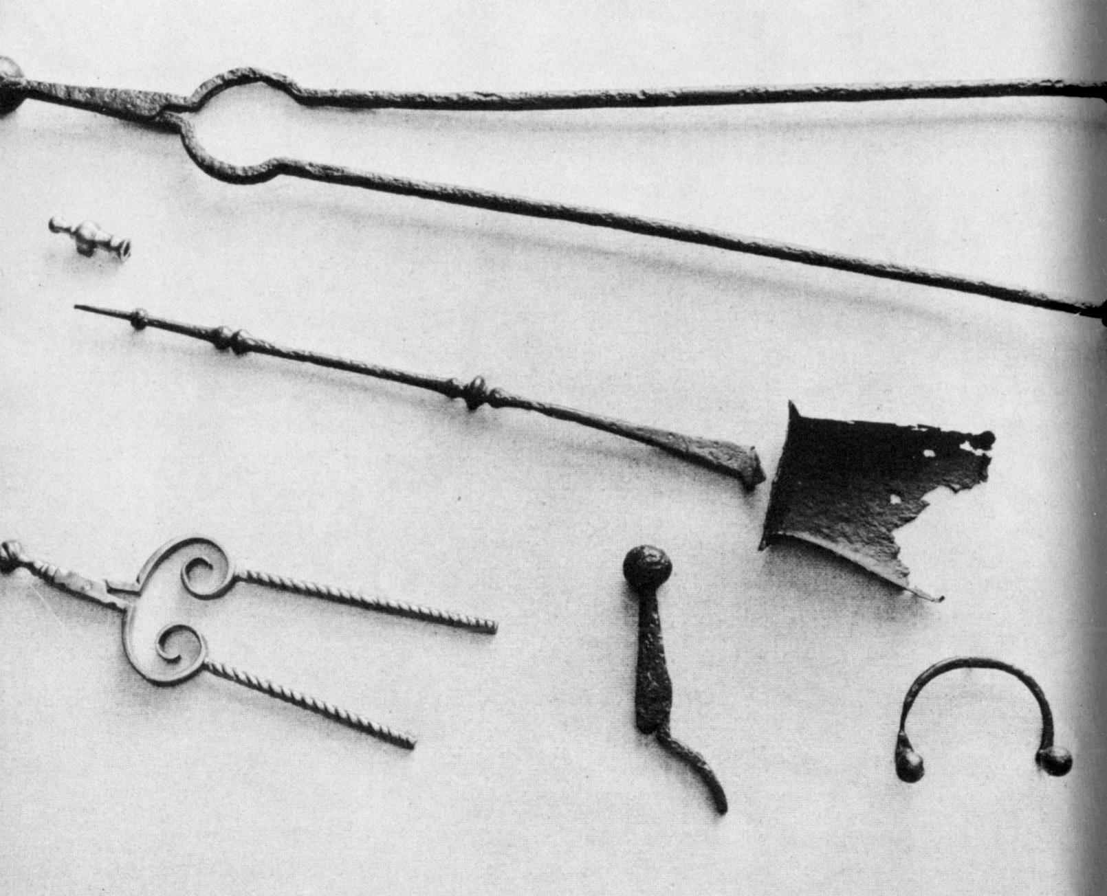 A large assortment of iron and brass Jew’s harps (also known as Jew’s trumps) have been found. This small instrument is lyre-shaped, and when placed between the teeth gives tones from a bent metal tongue when struck by the finger. Modulation of tone is produced by changing the size and shape of the mouth cavity.