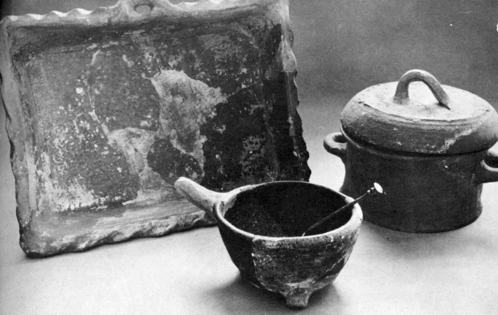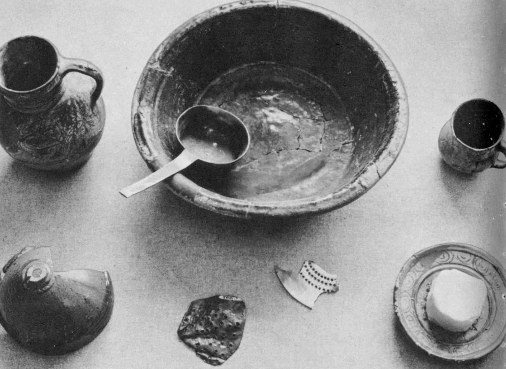 Earthenware milk pans, bowls and pots, iron hoops (from wooden vessels), an earthenware funnel, and parts of skimmers, sieves, and ladles have been excavated. All these are evidence that dairying was an important household industry. This activity was usually carried on in a brick-paved room (with slatted windows) located on the northwest side of the house. Cheese, as well as butter, was probably made in the same room.