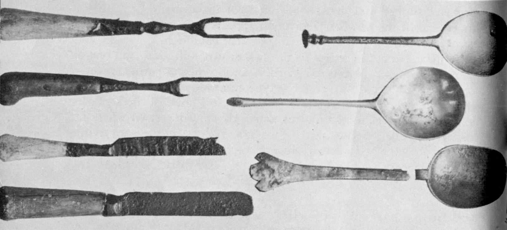 A large and varied assortment of cooking utensils and kitchen accessories have been excavated, including kettles, pots, pans, skillets, frying pans, toasters, broilers, griddles, skimmers, skewers, spits, ladles, pothooks, trammels, cranes, trivets, cleavers, knives and forks, sieves, and colanders. While only a few are complete others are almost complete or at least easily recognizable.