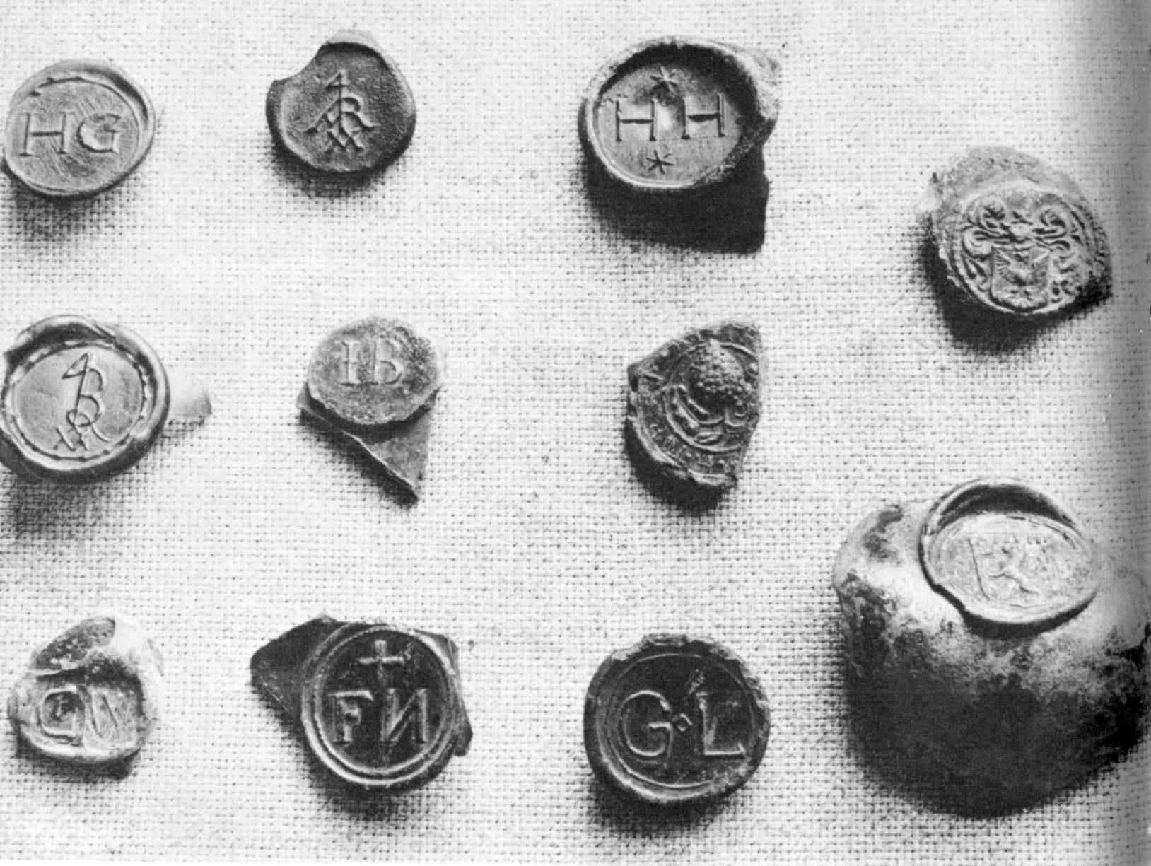 About 1650 the practice of affixing glass seals or buttons on the shoulders of English wine bottles was begun. The seal was inscribed with a name, or initials, or a date; sometimes a coat of arms or a crest, or other device or ornament. Many of these glass bottle seals have been found at Jamestown. As a rule, only the wealthy and influential planters had seals stamped on their wine bottles.