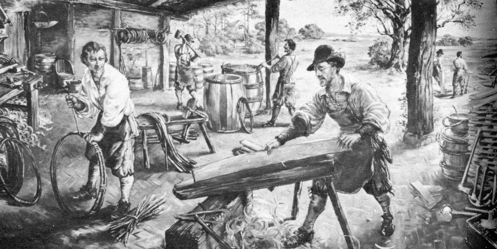 Some tools used by the cooper, including draw shaves, adzes, plane irons, and race knives, have been excavated. Several barrel staves—probably made at Jamestown—were found in a few wells. Because of the great demand for barrels, casks, and hogsheads (both in Virginia and England) the Jamestown cooper was a busy artisan. His products were needed at all times, especially after 1620 when the Virginia settlers began shipping large quantities of tobacco to England in wooden hogsheads.