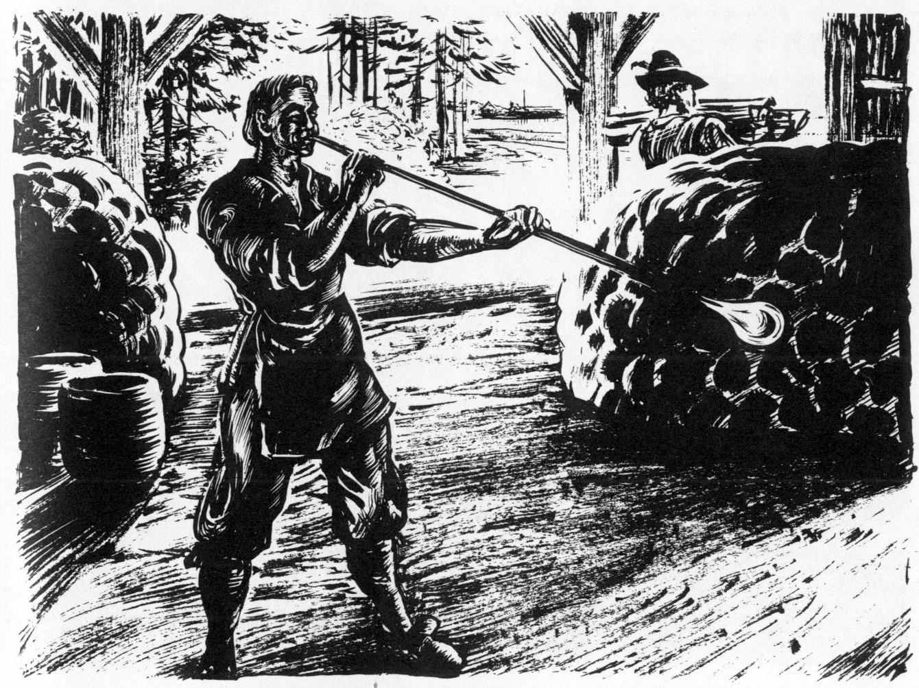 Glassblowers were working at Jamestown in 1608-09, and again in 1621-24. The trial glass they made in 1608 was sent to England—the first glass manufactured by Englishmen in the New World. The small glass fragments excavated at the furnace sites do not reveal what was produced, but probably nothing more complicated than window glass, bottles and vials, and plain drinking glasses. It is believed that the small glass factory at Jamestown was the first English “factory” in America.